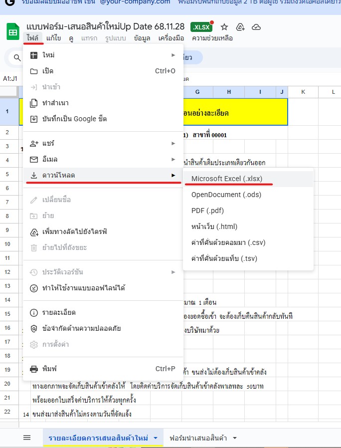 - เปิดไฟล์ที่ดาน์โหลดและกรอกรายละเอียดสินค้าที่ต้องการเสนอขายลงในแบบฟอร์ม